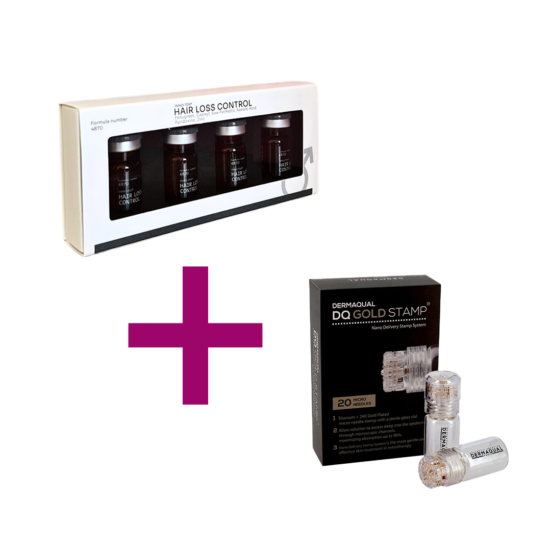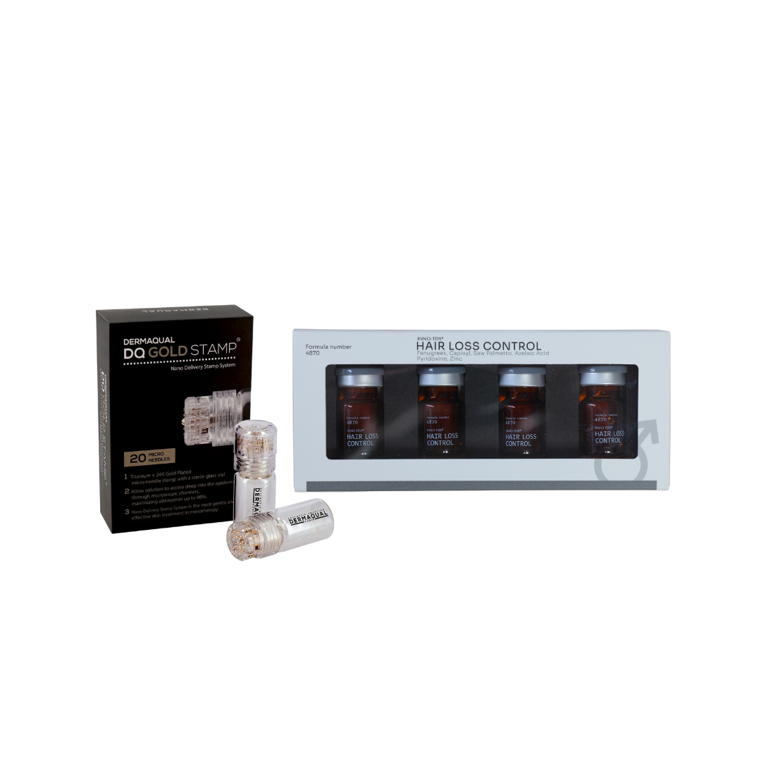 يجمع هذا الباكج بين أمبولات Inno Aesthetics Hair Loss Control وعبوة Dermaqual DQ Gold Stamp الذهبية المزودة بإبر ميكرو من التيتانيوم المطلي بالذهب عيار 24 لعلاج فعّال لتساقط الشعر حتى الهرموني والوراثي.